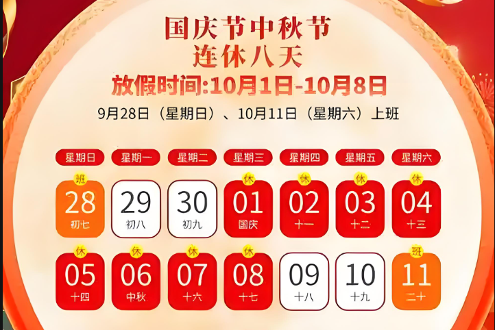 國慶節放假安排:10月1日(周三)至8日(周三)放假調休,共8天。9月28日(周日)、10月11日(周六)上班。